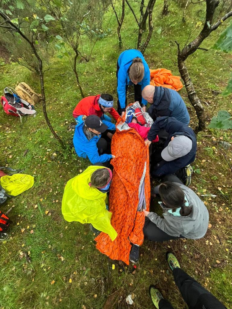 I find my patient propped up against the fallen branch of a tree, pine needles sprinkled over his jacket, and pinecones scattered around him on the ground. A chain saw gently hums to one side and a red stained trouser leg reveals the urgency of the situation. My colleague pushes a gauze bandage deep into a thigh wound, as I tighten a torniquet around the his thigh. A few frantic minutes pass, filled with “good enough” assessment and treatment – oxygen is applied, an IV fixed and tranexamic acid infused.